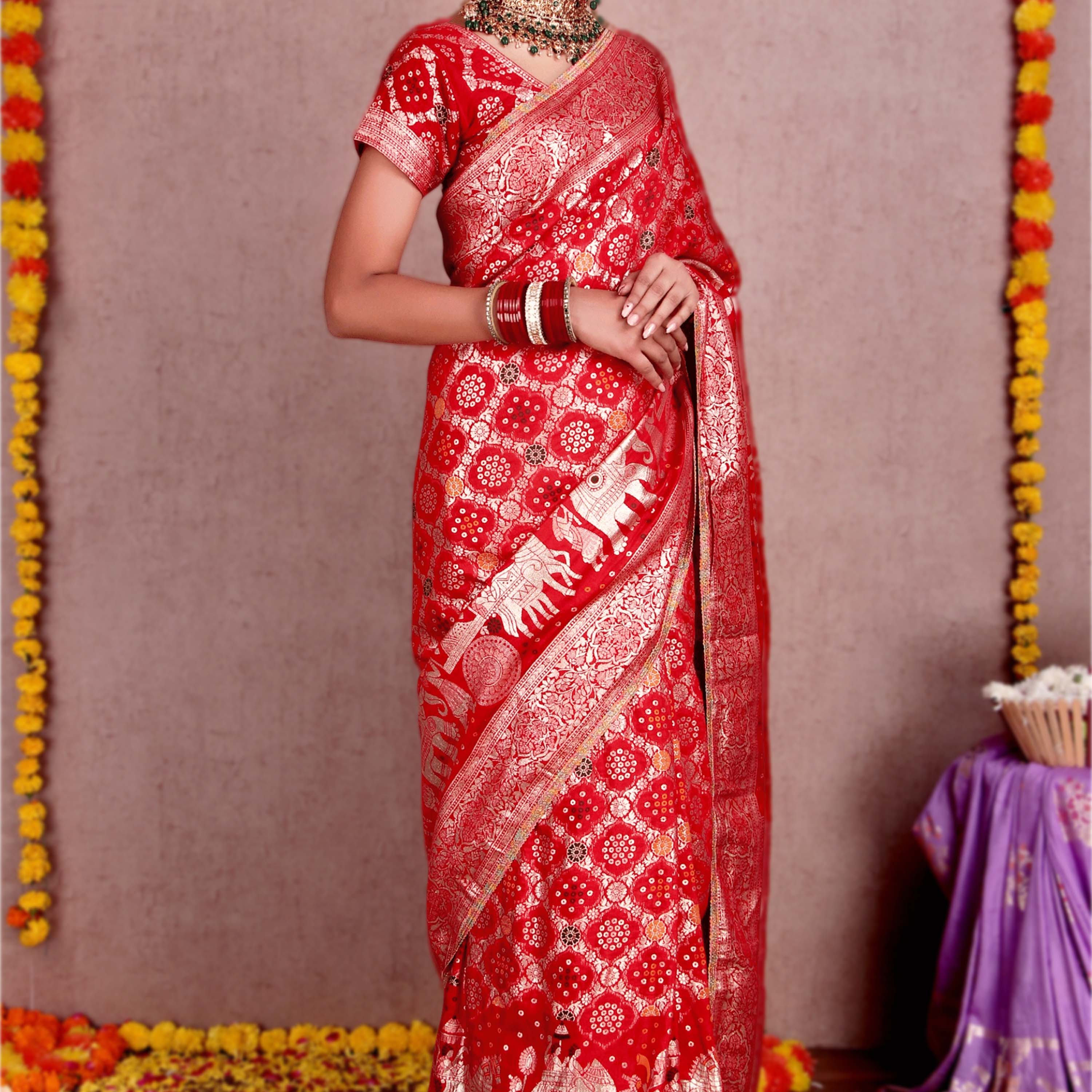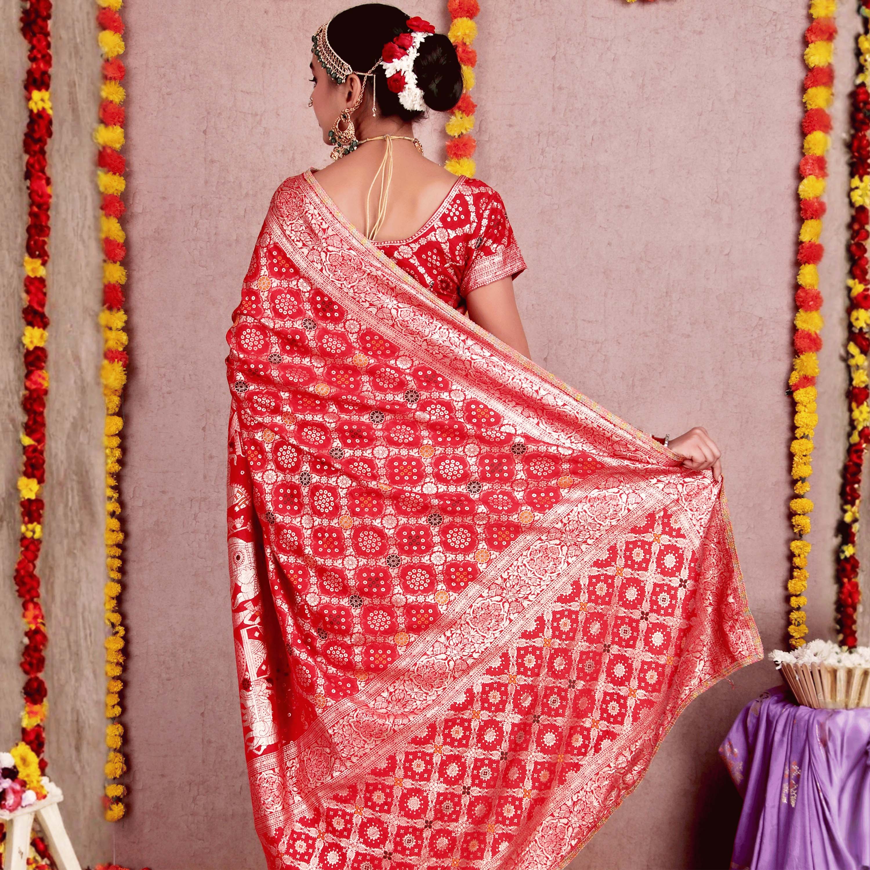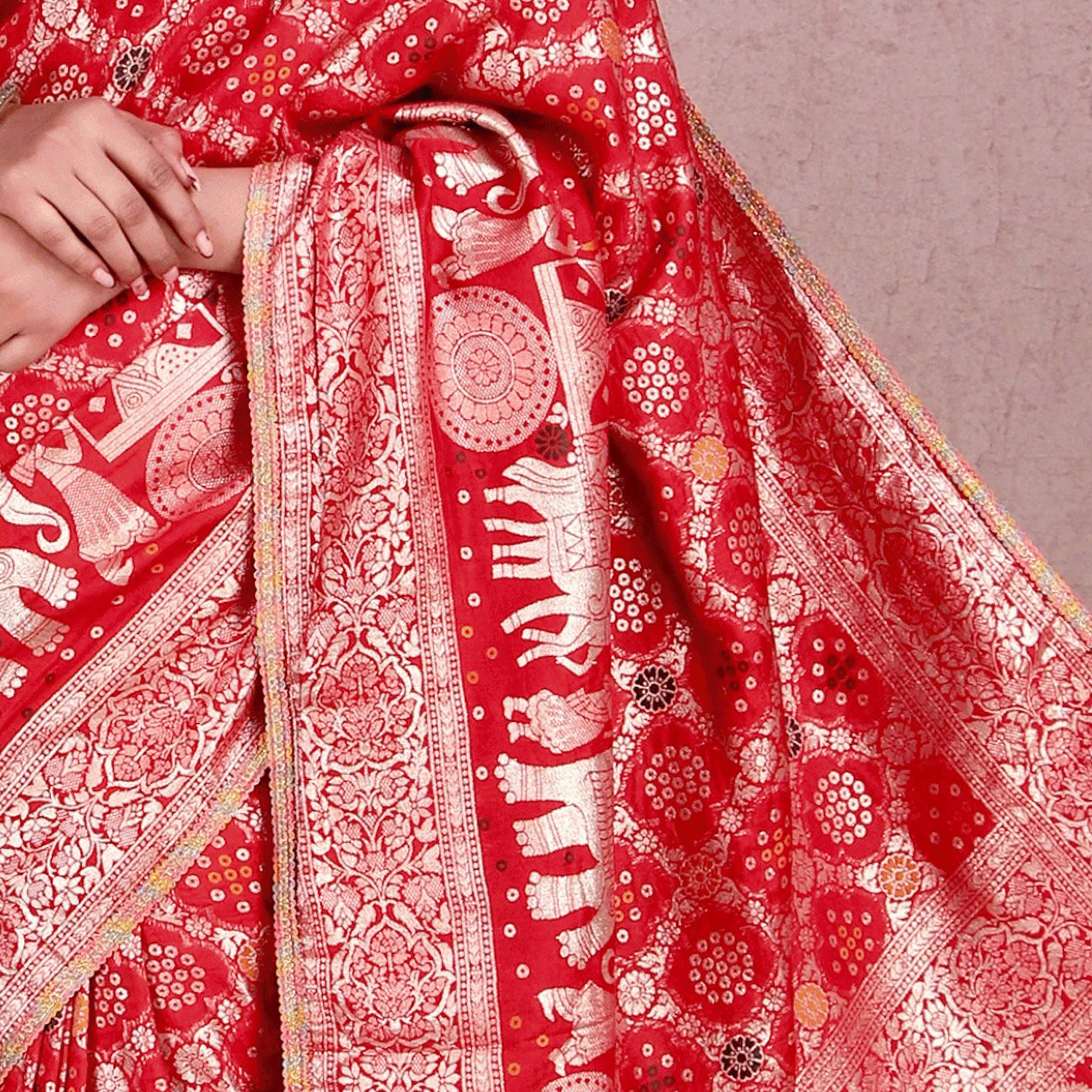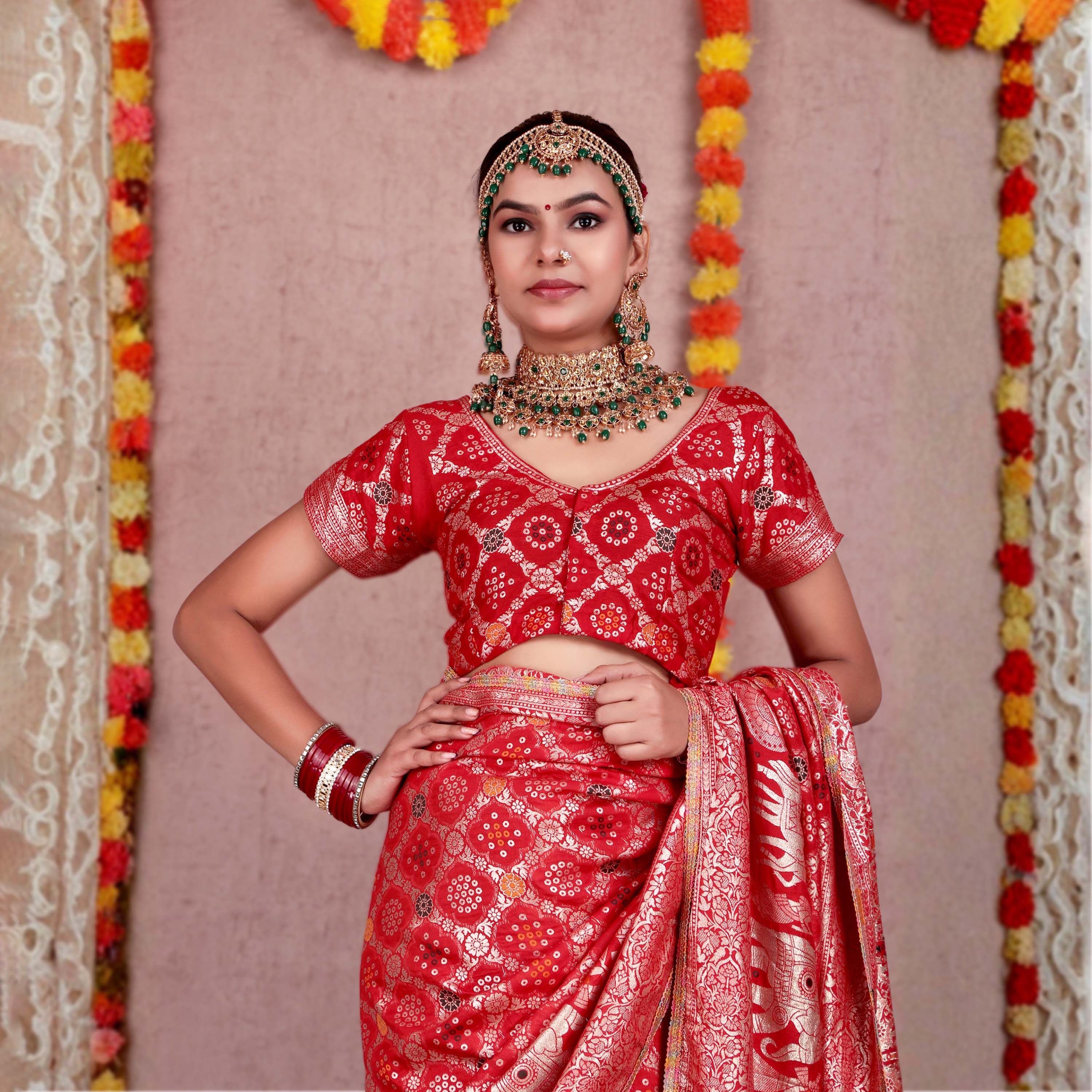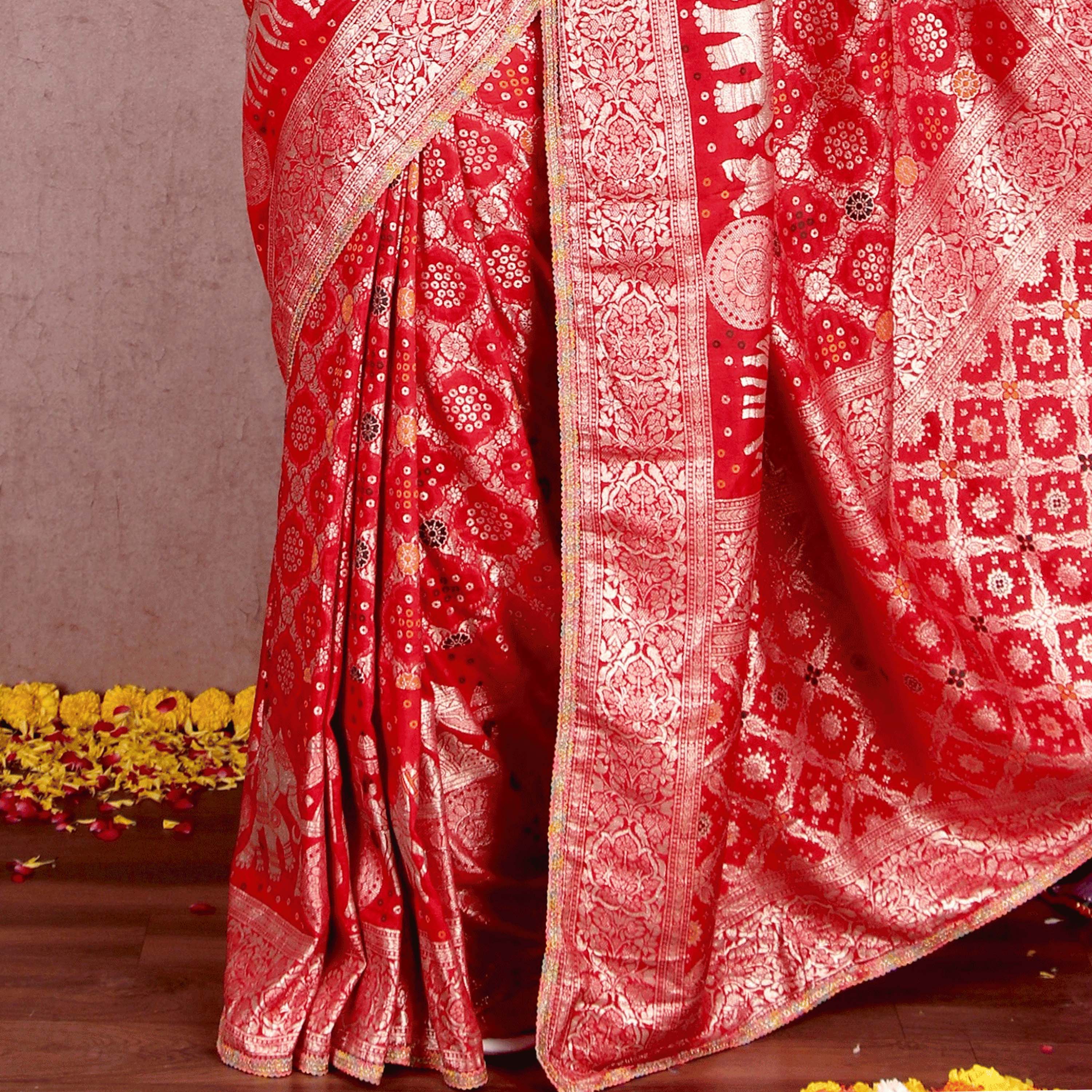 Stunning Red Banarasi Saree with Crush Silk and Lace Border