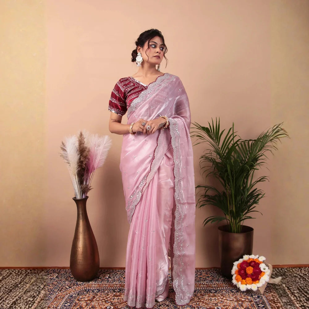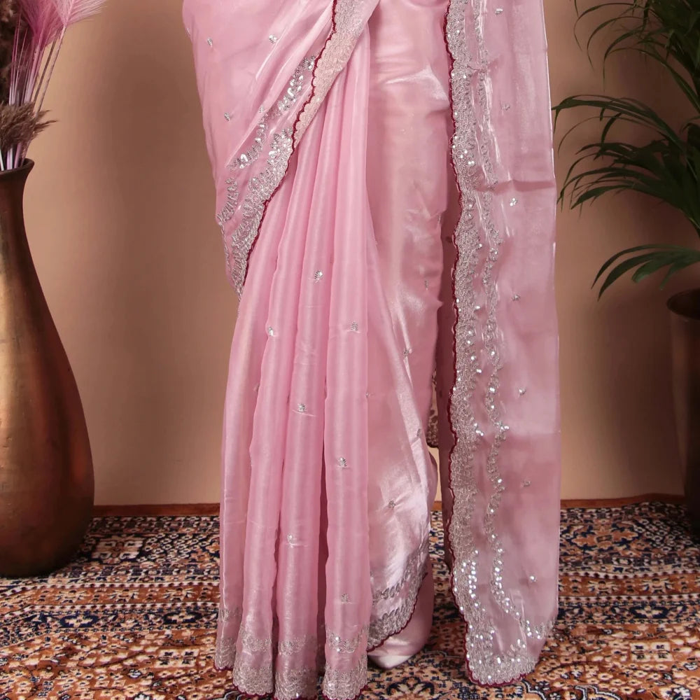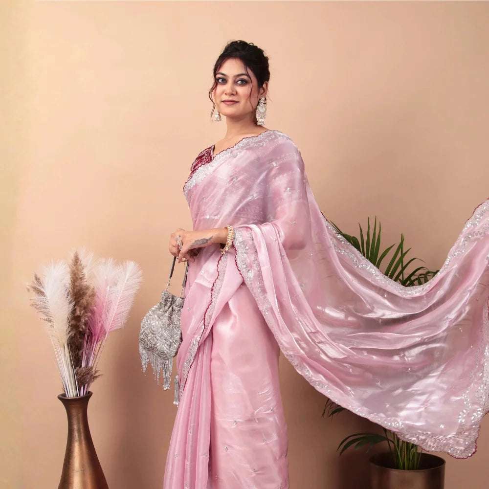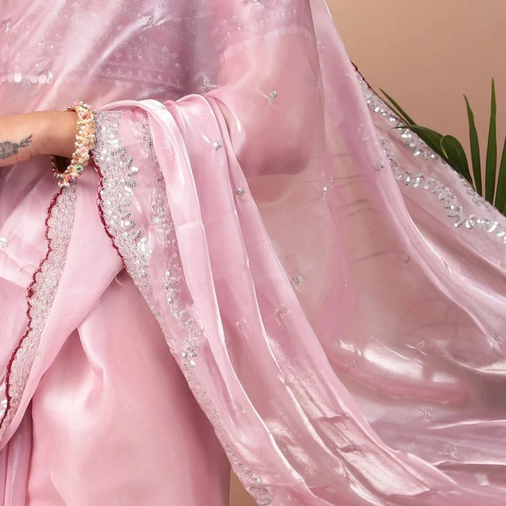 Baby Pink Saree by Jimmy Choo – Satin with C-Pallu Work and Blouse