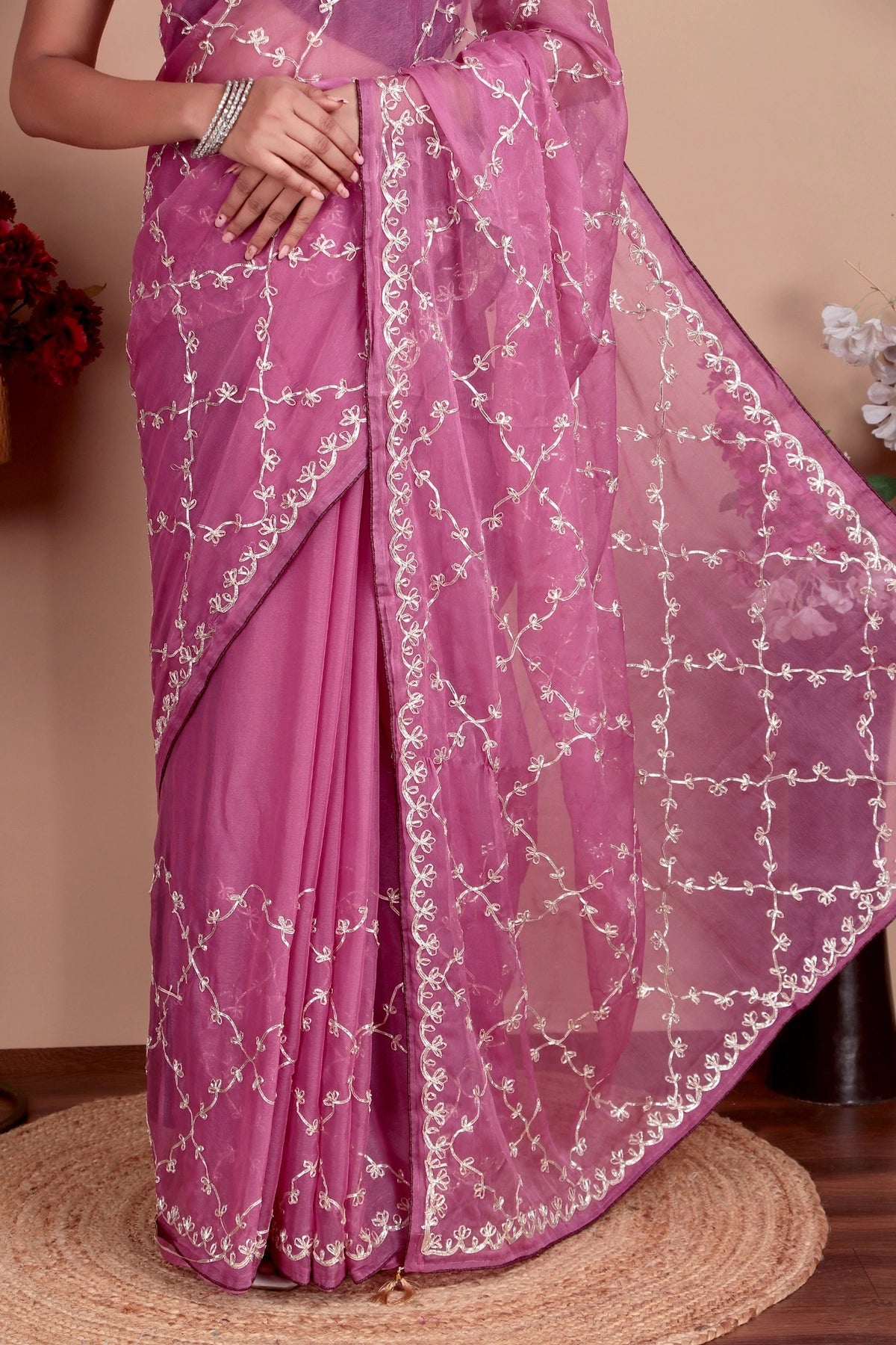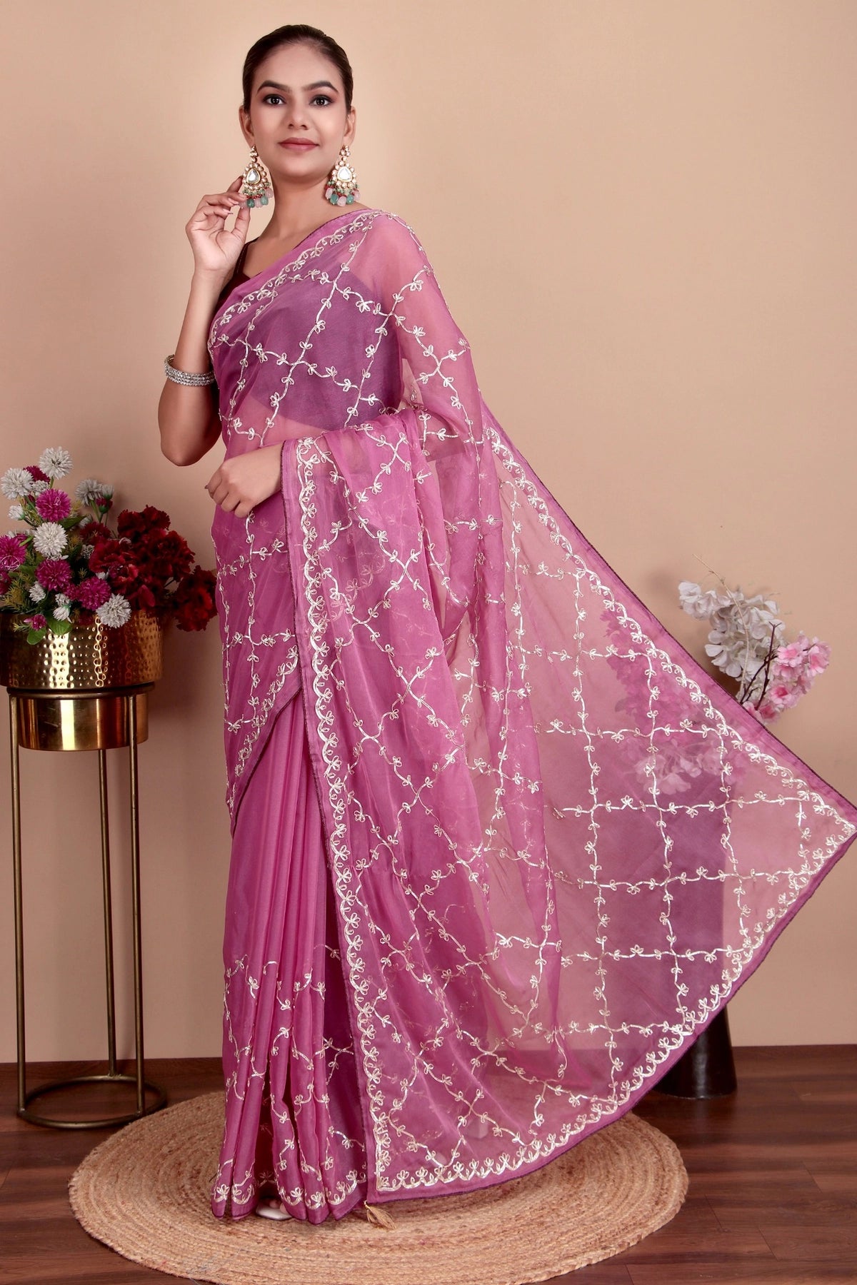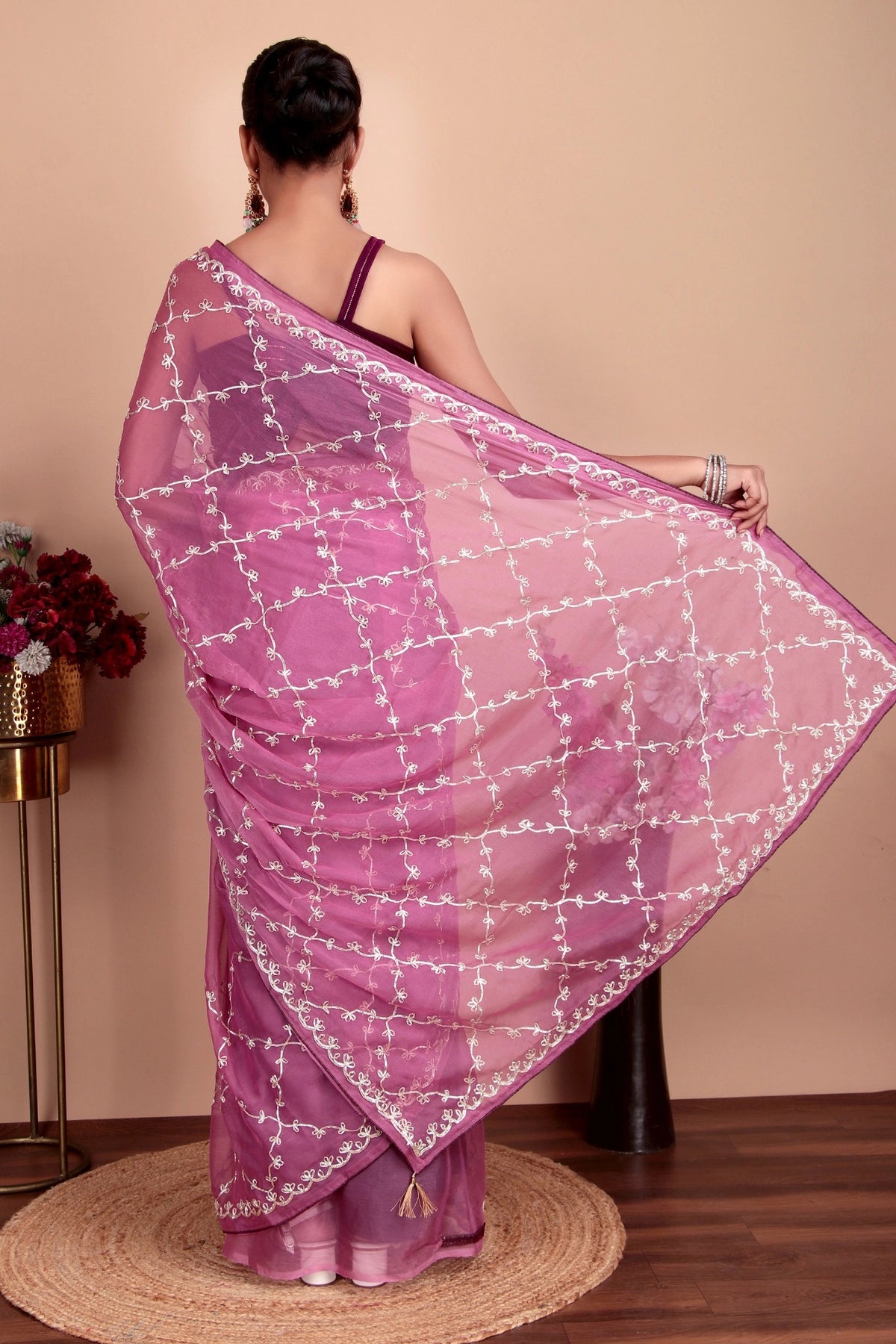 The luxurious viscose chiffon silk fabric in dusty pink creates a graceful and romantic look. The intricate sequence and embroidery work adds shimmer and richness throughout the saree, making it perfect for special occasions. This saree beautifully combines traditional craftsmanship with contemporary elegance, offering a sophisticated choice that drapes beautifully.