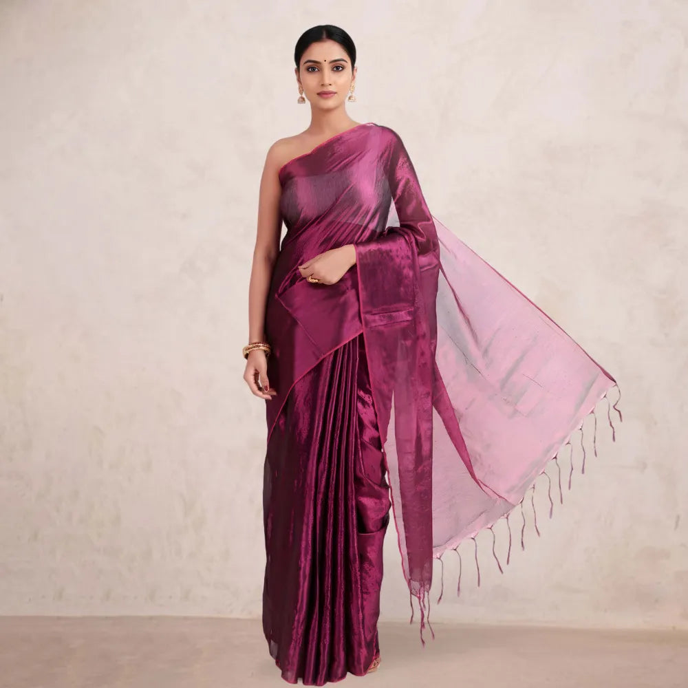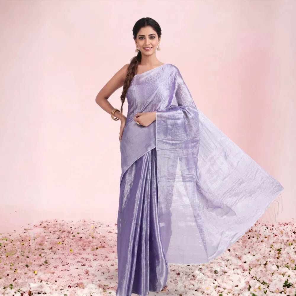 This mahendi green tissue silk saree blends traditional richness with a soft, contemporary charm. The natural glossy finish and lightweight drape create a polished, luxurious look suitable for both day and evening functions. The embellished-inspired effect adds subtle sophistication, perfect for women who prefer elegant minimalism over heavy embroidery.