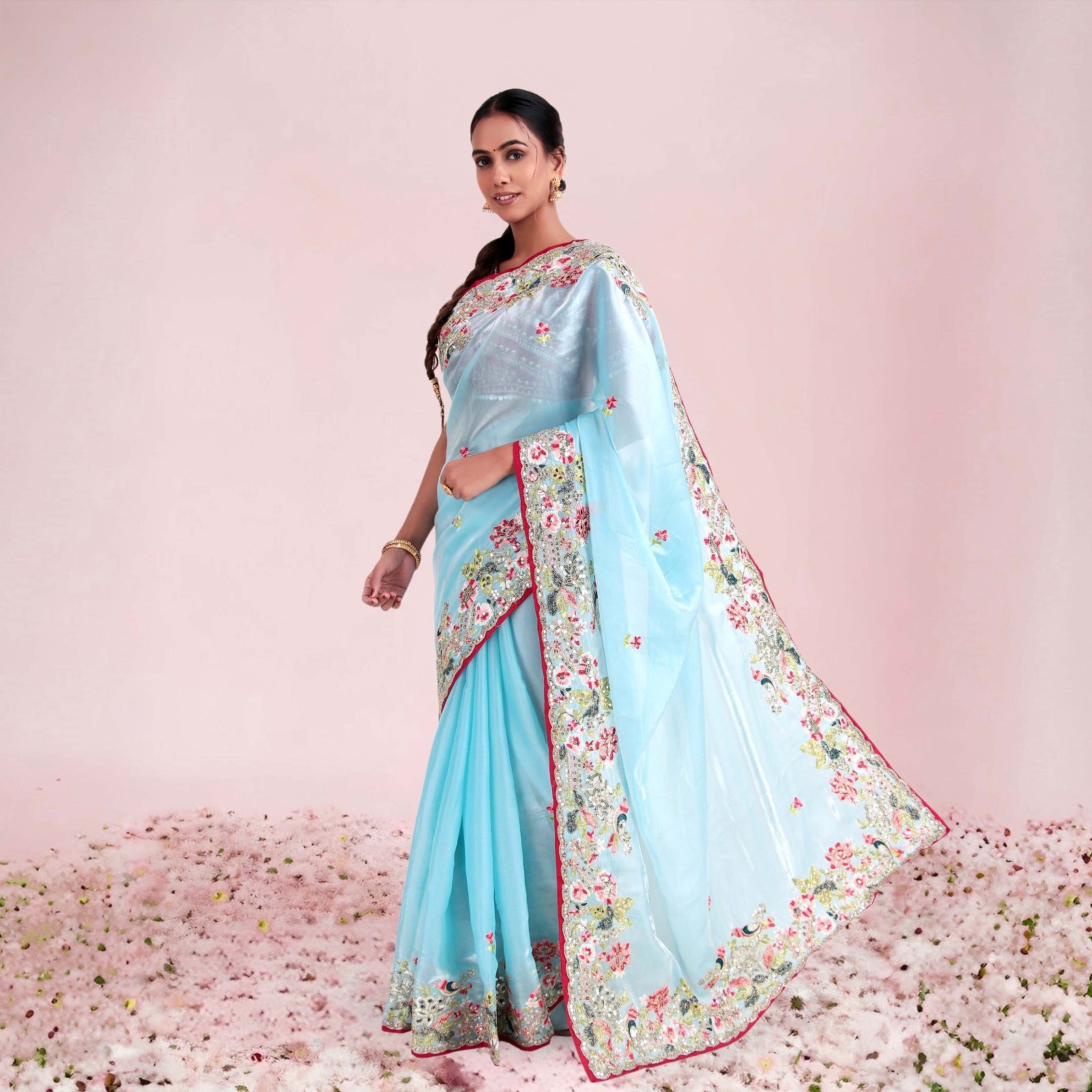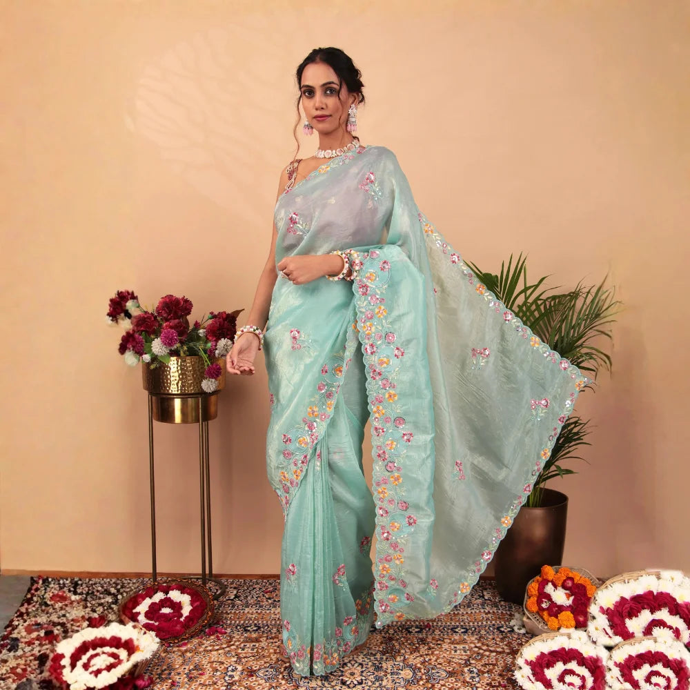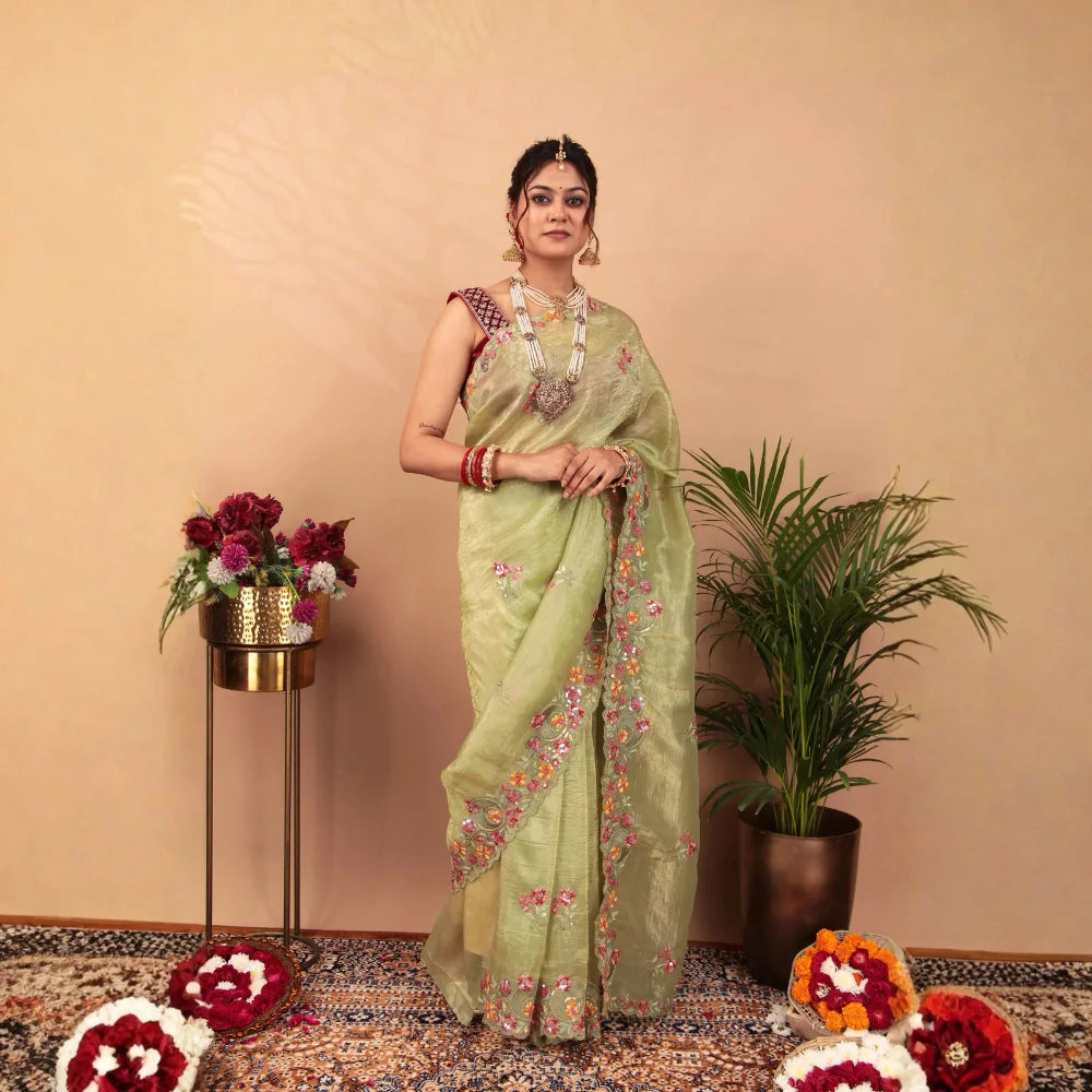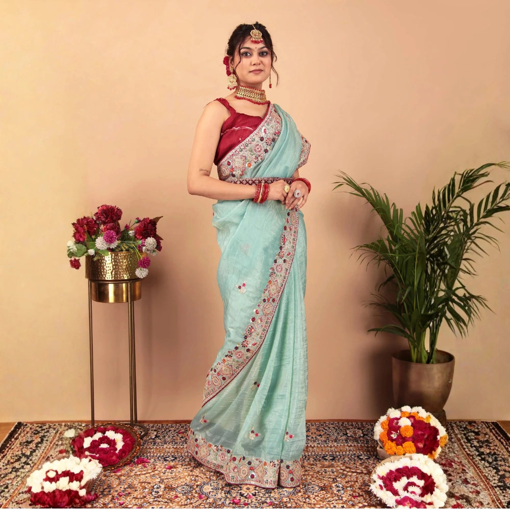 Perfect for daytime weddings, festive celebrations, and special occasions, this saree offers a fresh take on traditional elegance with its unique color palette and exquisite craftsmanship.