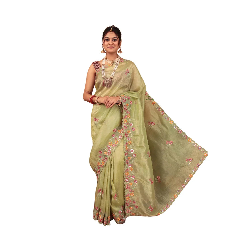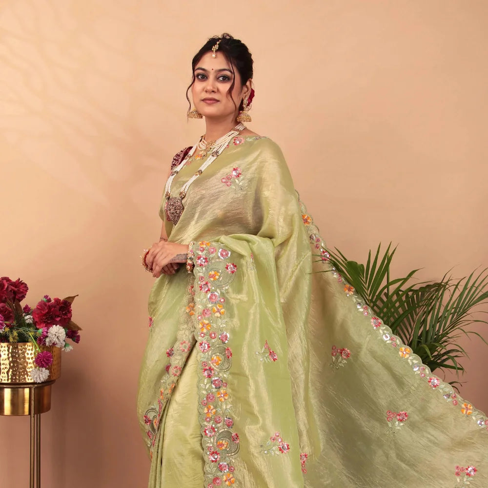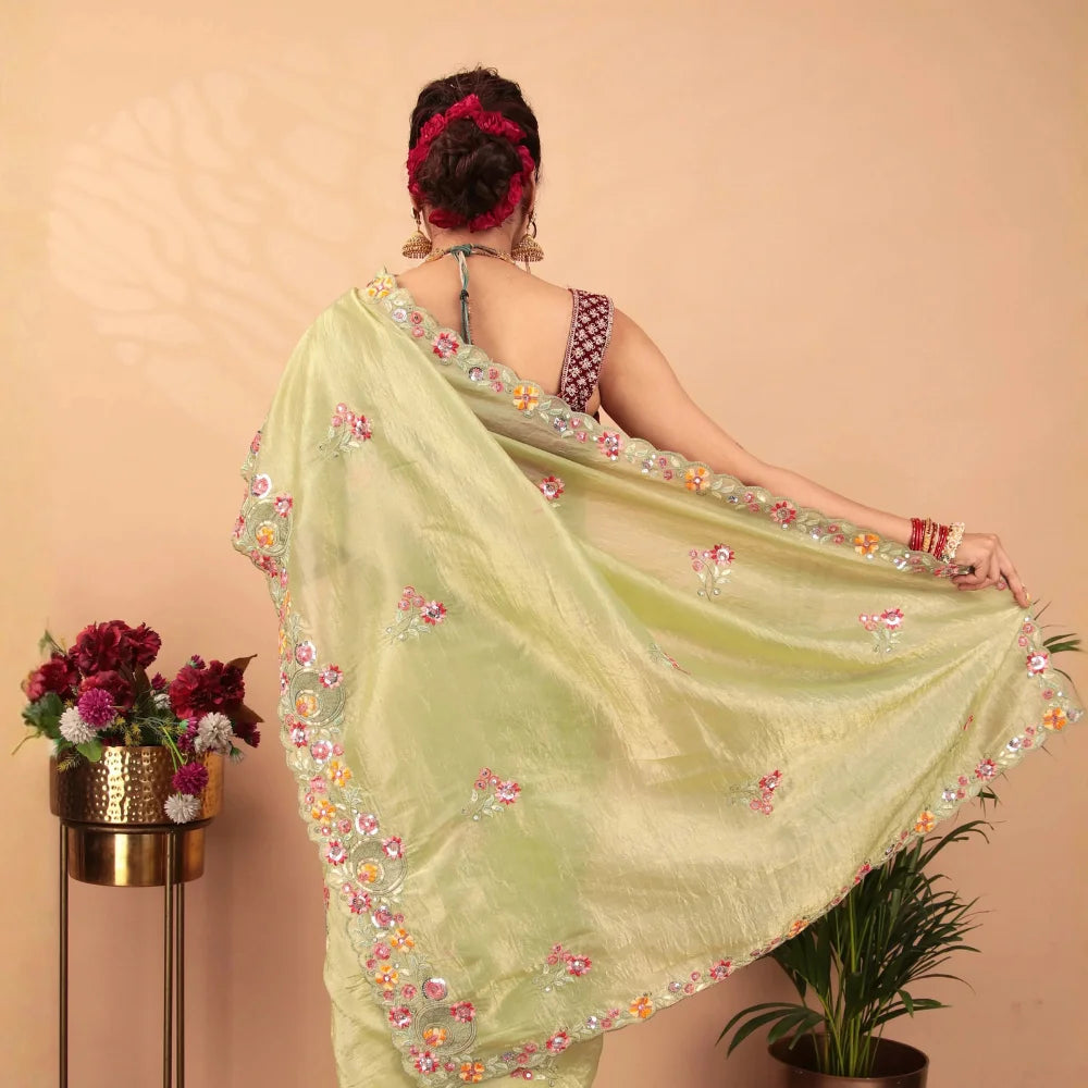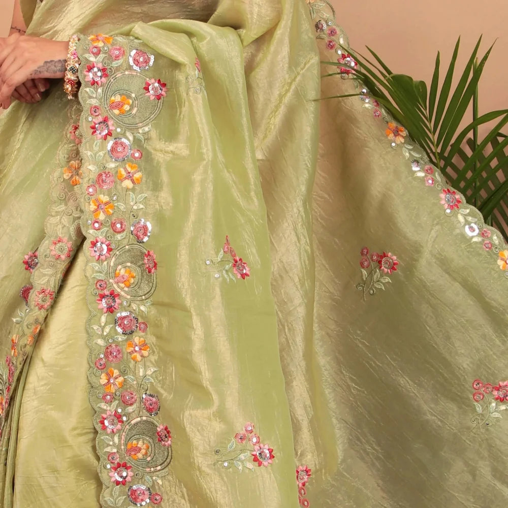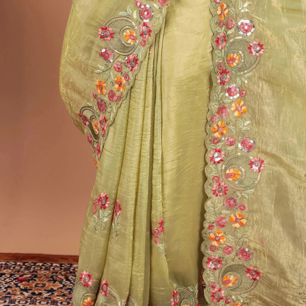 The luxurious crush silk fabric in refreshing pista green with gold highlights creates a unique and eye-catching look. The intricate thread and sequence work adds sparkle and dimension, while the cutting border provides a contemporary finishing touch that perfectly complements the vibrant color.