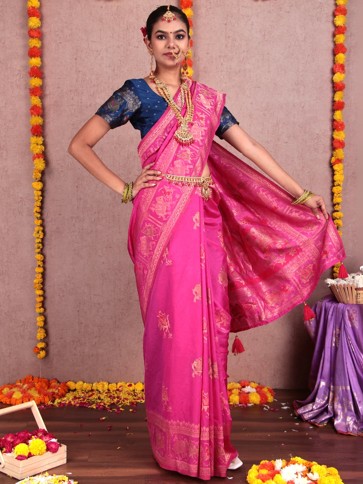 Refresh your ethnic wardrobe with this stunning pista green gold crush silk saree featuring exquisite thread and sequence work with a beautiful cutting border.