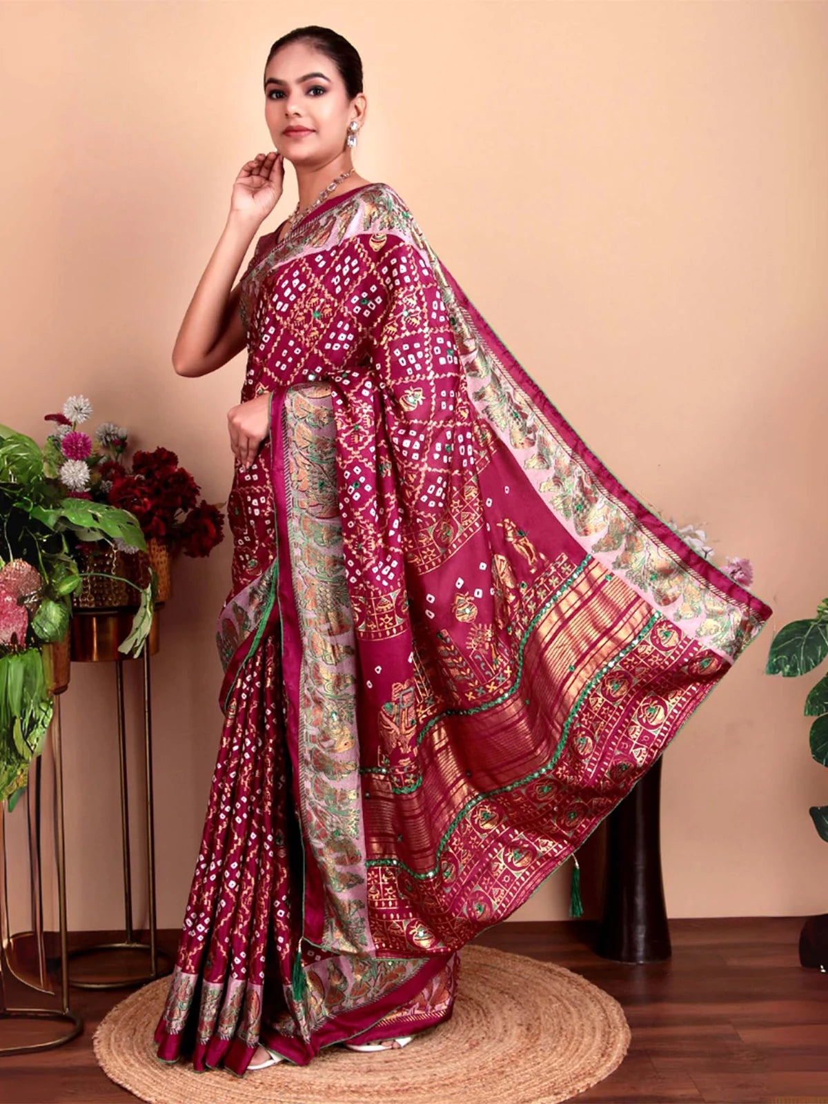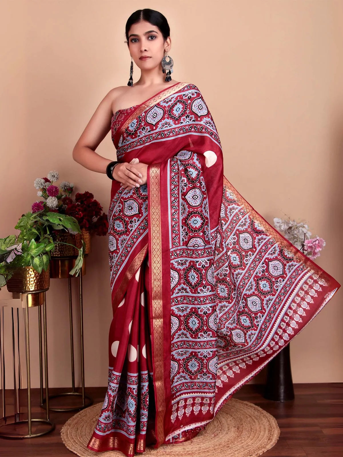 Deep wine satin chiffon saree with shimmer effect and delicate embroidery. Lightweight yet dressy, perfect for evening occasions and festive events.